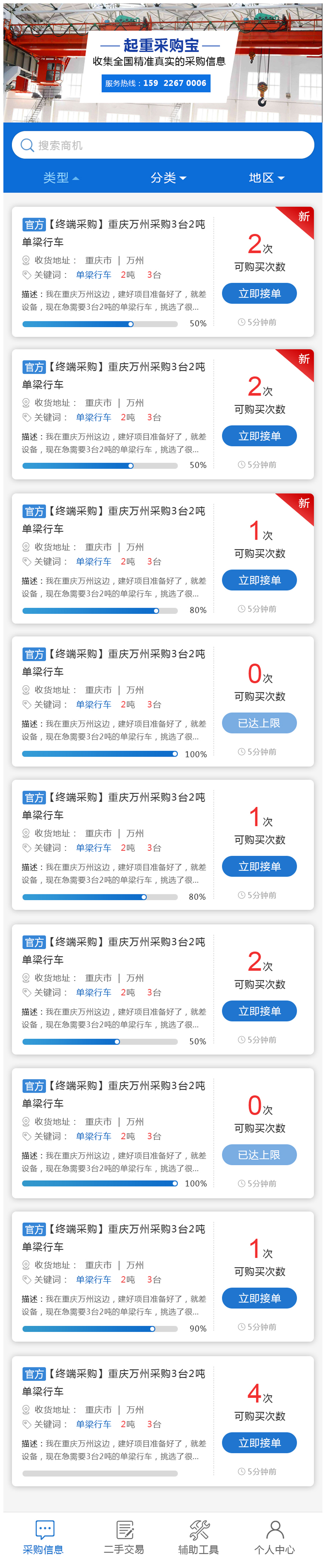 Project Description 欢迎您关注起重采购宝,我们每天为您实时推送全国各地真实有效的起重设备采购信息,让您直接面对终端采购客户,起重采购宝助您生意更上一层楼! Official website address 开封# I want to share
